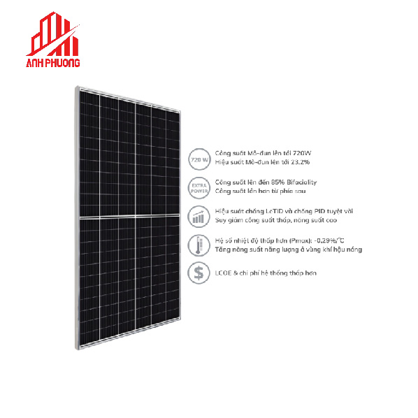 Tấm Pin năng lượng mặt trời Canadian 720W, sử dụng công nghệ N-Type tiên tiến nhất hiện nay. Giúp tăng hiệu suất chuyển đổi năng lượng lên đến 23.2%, cao hơn so với các loại khác trên thị trường.